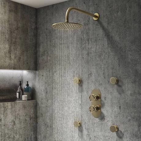 The Arezzo brushed brass industrial-style concealed thermostatic shower valve with built-in diverter features a stripped-down aesthetic with round knurled textured tap heads, perfect for creating an eye catching industrial look in your bathroom.Â