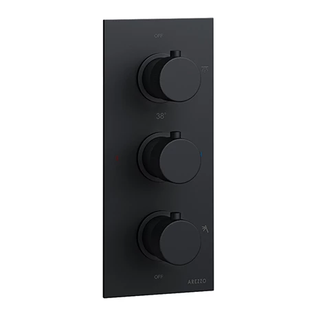The Arezzo Concealed Thermostatic Shower Valve features features an striking round design with a contemporary matt black finish and an decorative fluted texture around the controls. This ‘triple’ shower valve is perfect for installing in a concealed arrangement, linked to two outlets.Â