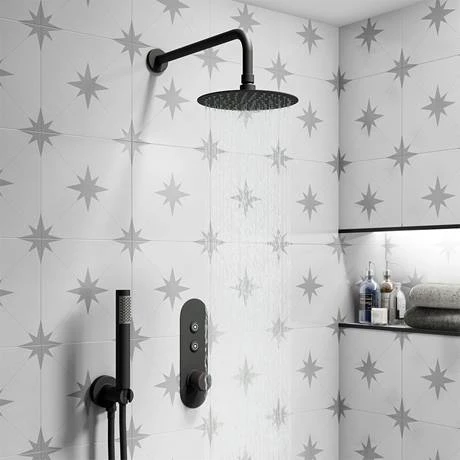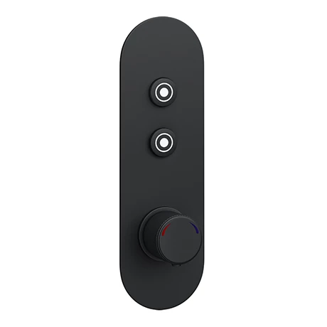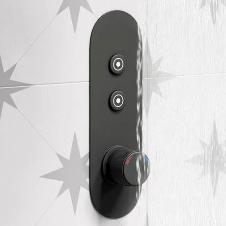 The stylish Arezzo industrial-style matt black 1 touch push button smart control shower valve is perfect for adding a striking finishing touch to your contemporary bathroom. Features easy to use instant 1 touch push button start/stop water flow activation. Temperature and flow is easily adjusted by simply turning the mixing valve. Crafted to the highest standards, this stunning shower valve features a round knurled textured tap head controls, perfect for creating an eye catching industrial look in your bathroom. Plated in a matt black finish which is highly resistant to corrosion. This ‘twin’ shower valve is perfect for installing in a concealed arrangement, valve diverts between two shower accessories: fixed head/slide rail kit, fixed head/body jets or slide rail kit/body jets.Â
