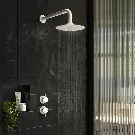 The Arezzo Matt White Concealed Individual Stop Tap and Thermostatic Control Shower Valve Pack features a minimalist round design. This modern shower valve pack is perfect for installing in a concealed arrangement, linked to a fixed shower head.Â