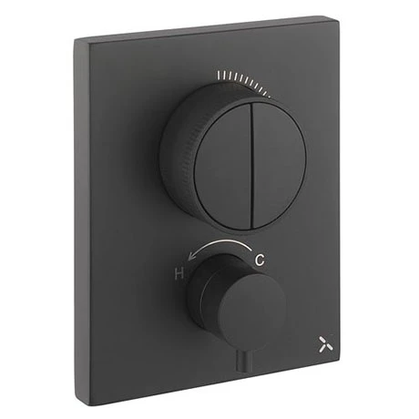 Two Outlet CROSSBOX deliver water to two water outlets, where you can divert between the two or have both outlets on at the same time. If you want a quicker and easier way to install a shower valve that projects less, choose CROSSBOX. Trim sets include flow control, thermostat, backplate and handles.