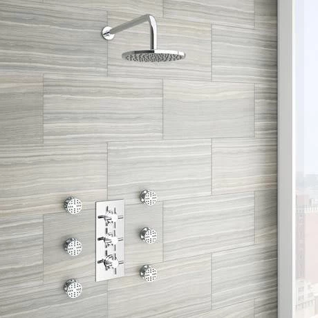 The minimalist Pablo triple concealed thermostatic shower valve brings substantial elegance to the modern bathroom. This stylish concealed thermostatic triple shower valve offers thermostatic showering via three easy-to-operate controls.