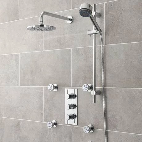 Features easy to operate controls, the top control operates one shower accessory the centre control adjusts the temperature and the bottom control operates the other shower accessory.
